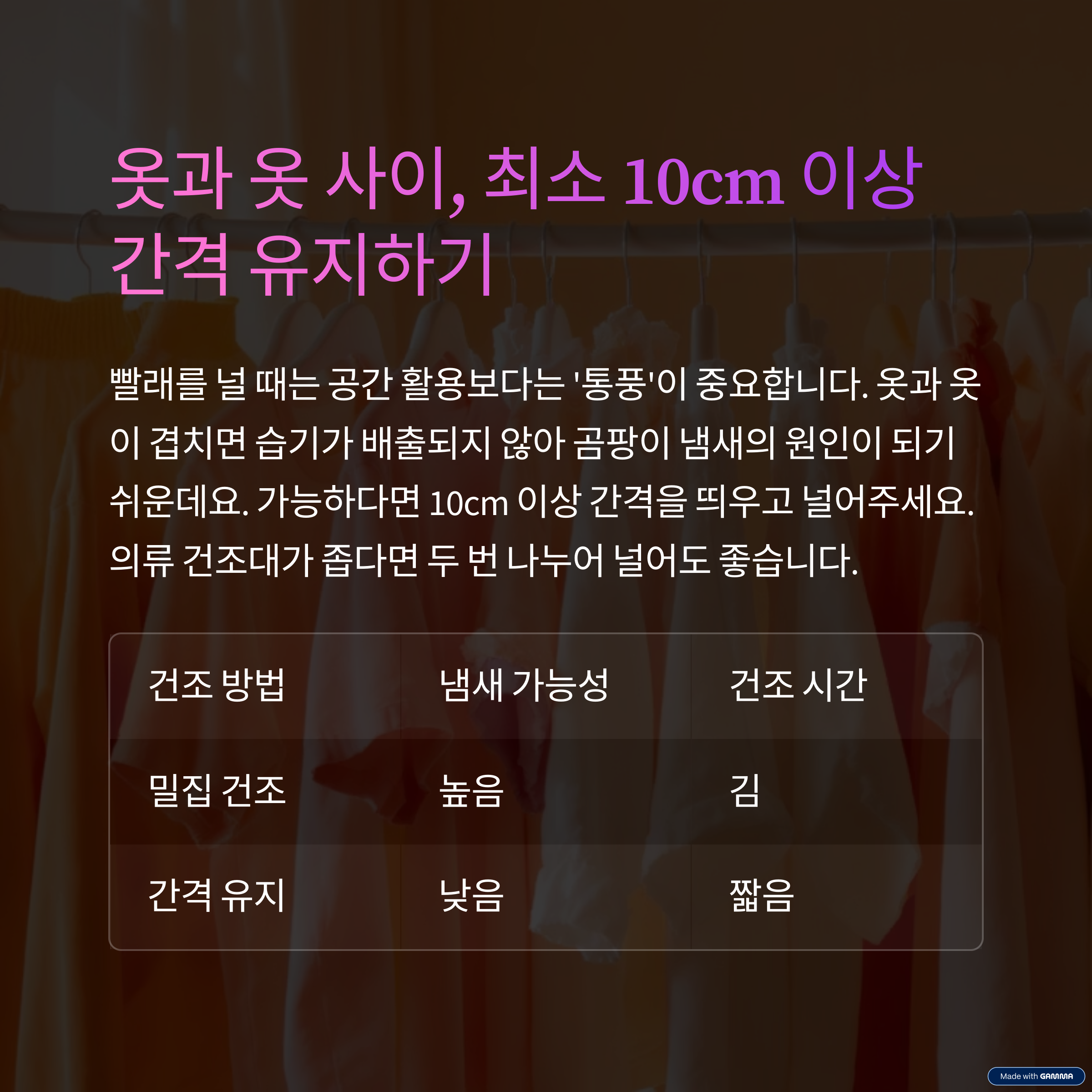 옷과 옷 사이, 최소 10cm 이상 간격 유지하기