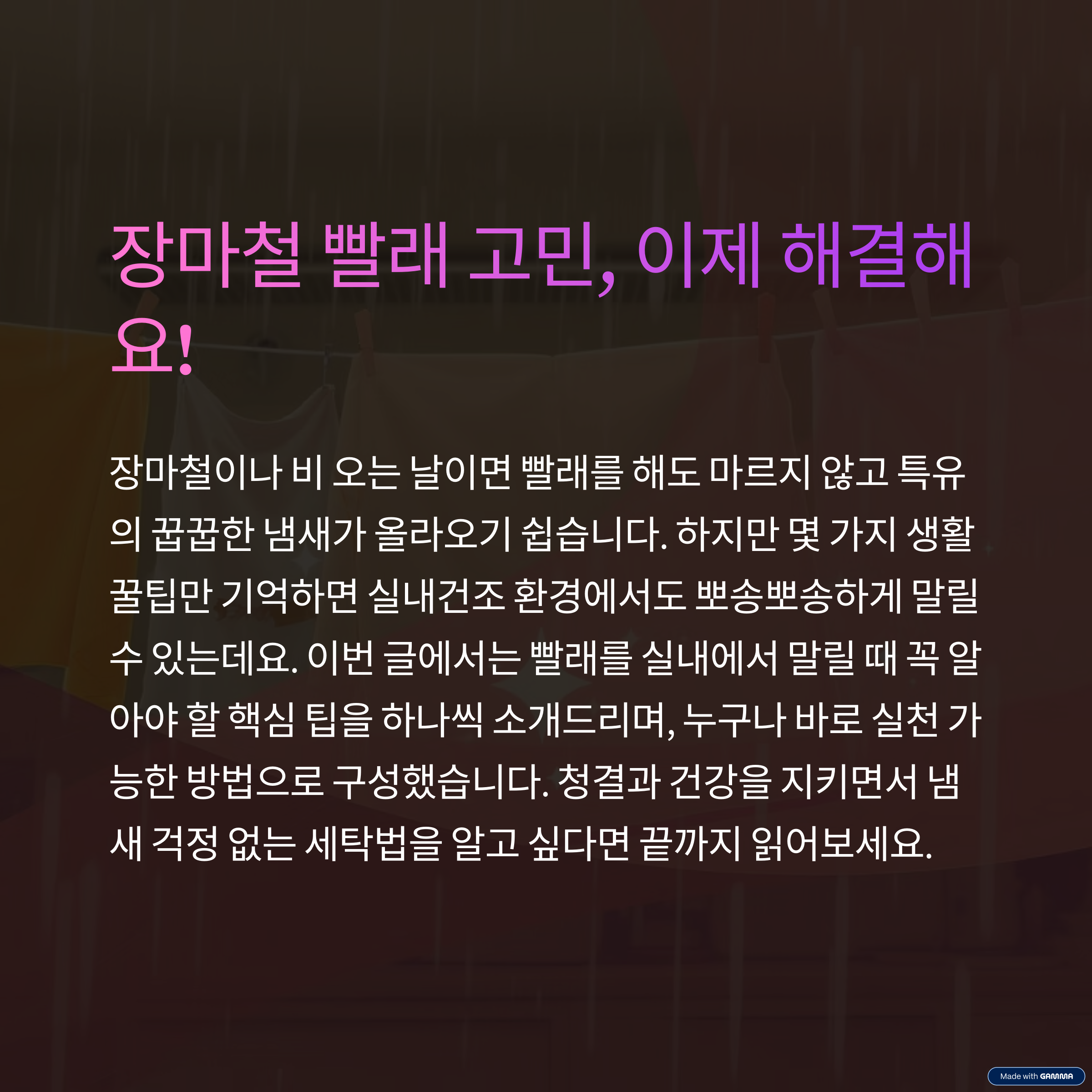 장마철이나 비 오는 날이면 빨래를 해도 마르지 않고 특유의 꿉꿉한 냄새가 올라오기 쉽습니다.