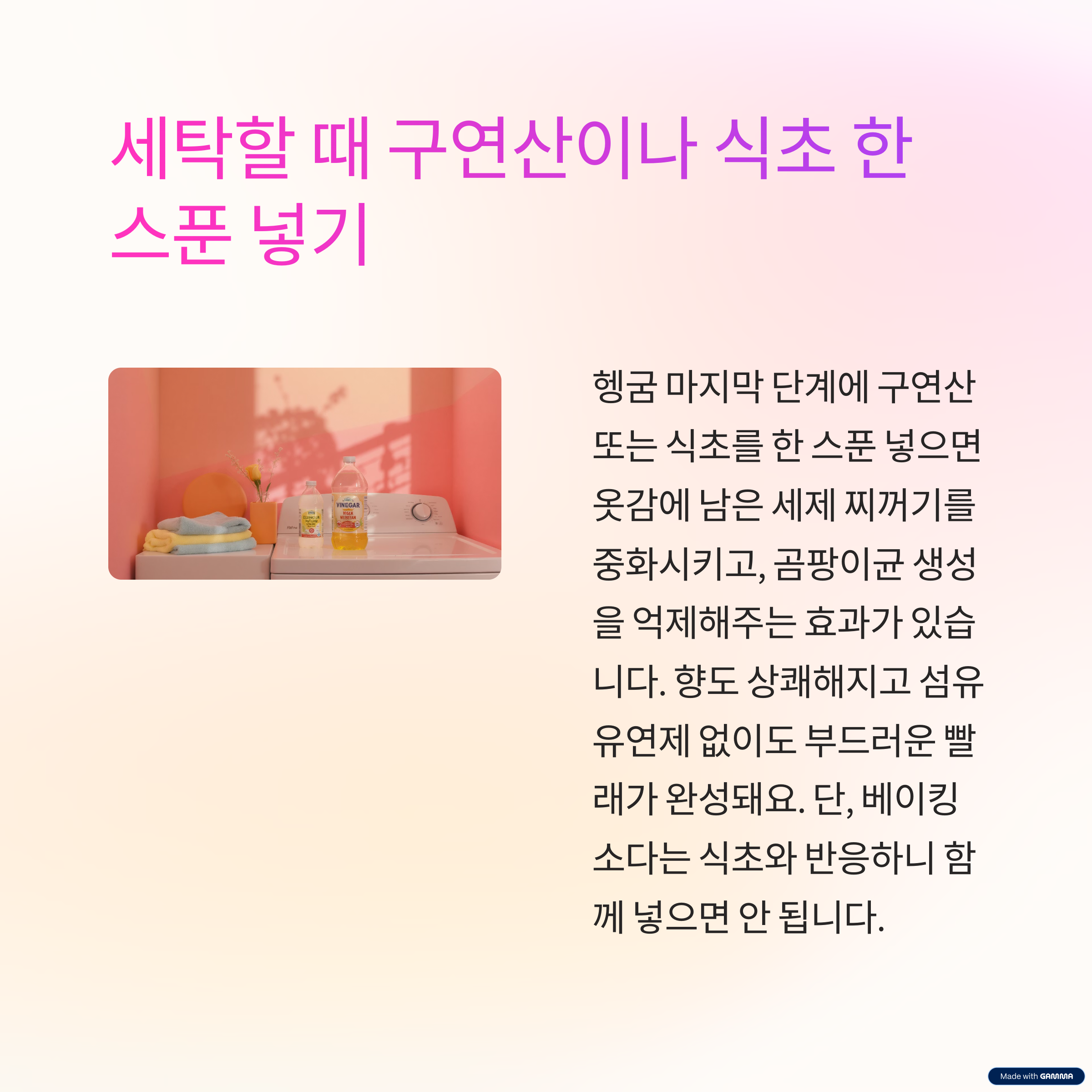 단, 베이킹소다는 식초와 반응하니 함께 넣으면 안 됩니다.