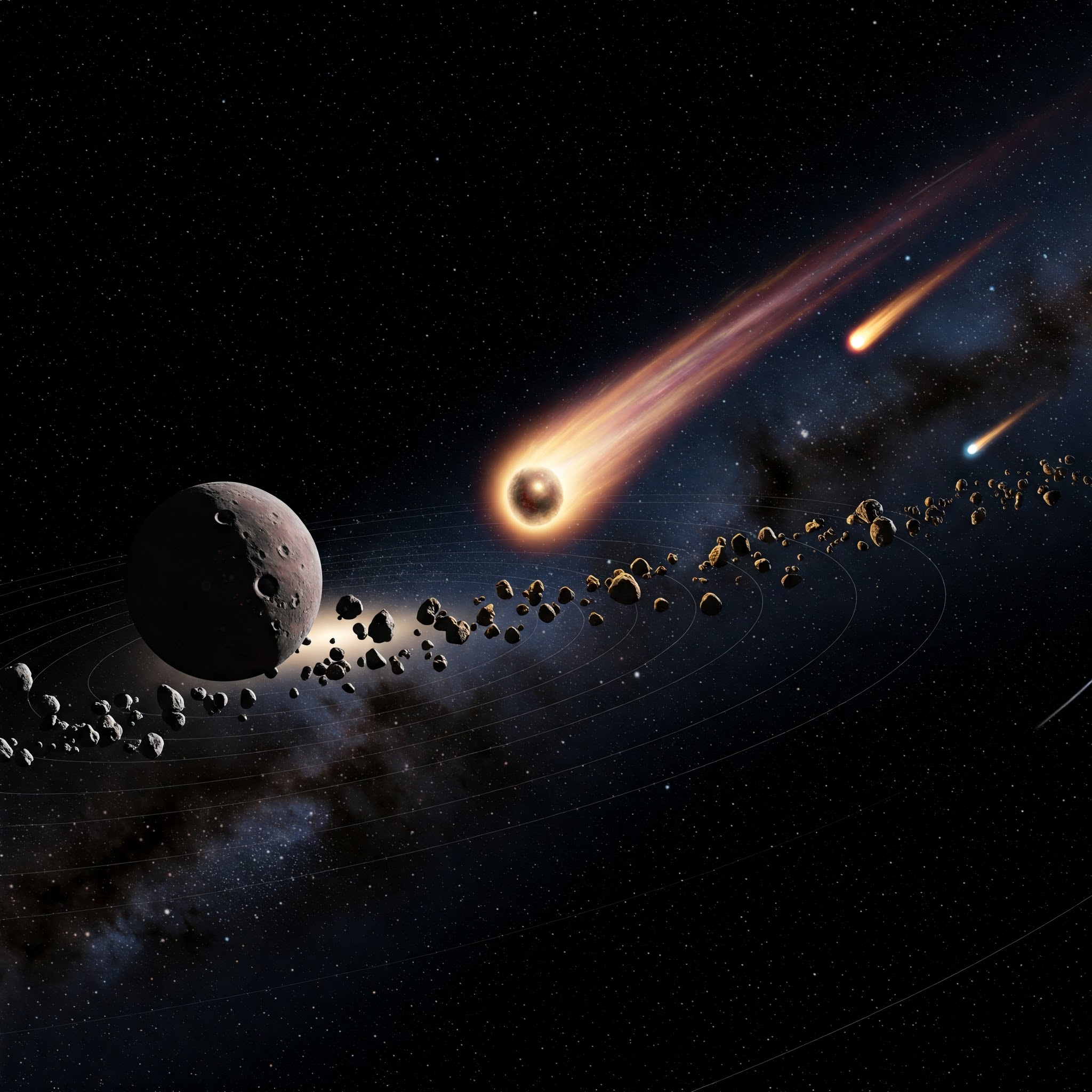 소행성의 궤도는 비교적 안정적인 반면, 혜성의 궤도는 매우 다양합니다. 일부 혜성은 짧은 주기로 태양계를 내행성까지 방문하는 반면(단주기 혜성), 다른 혜성들은 수천 년에서 수백만 년에 이르는 긴 주기를 가지거나, 단 한 번만 태양에 접근하고 다시는 돌아오지 않는 경우도 있습니다(장주기 혜성). 이러한 궤도의 차이는 소행성과 혜성이 태양계 내에서 형성된 위치와 겪어온 중력적 상호작용의 차이를 반영합니다. 소행성은 주로 태양계 형성 초기에 행성으로 성장하지 못한 잔해로 여겨지며, 혜성은 태양계 외곽의 차가운 환경에서 얼음 성분을 그대로 간직한 원시적인 천체로 간주됩니다.